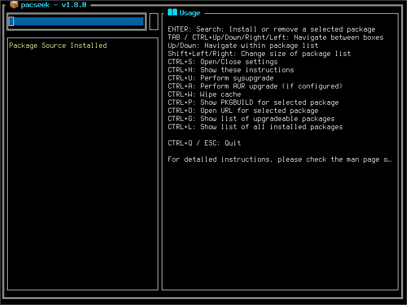 Pacseek ist eine Terminal -Benutzeroberfläche, mit dem die Arch Linux -Paketdatenbanken sowie das AUR (Arch User Repository) durchsucht werden kann. Pakete können einfach mit der Eingabetaste installiert/deinstalliert werden.