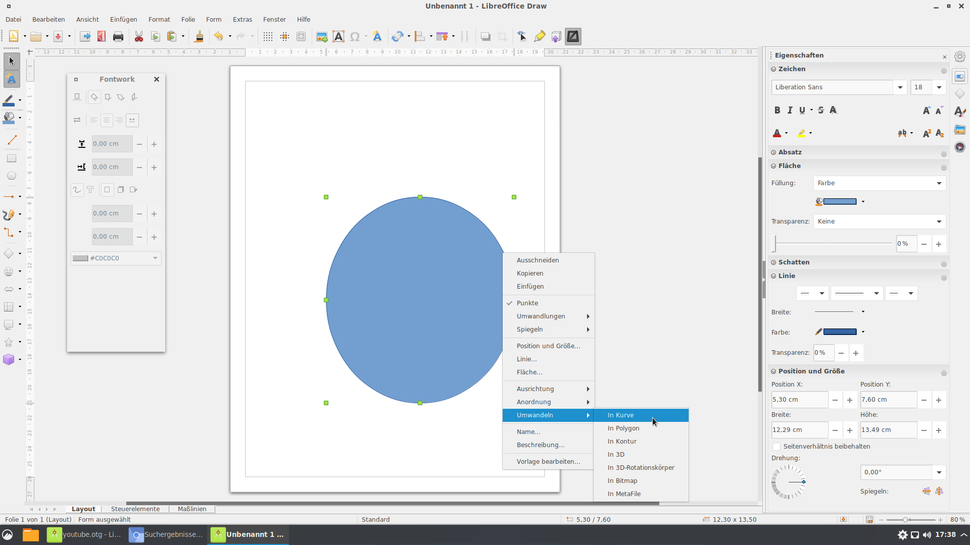 Bevor es jetzt weiter geht kommt ein neuer Schritt hinzu. Mit der Mouse auf den äußeren Rand des Kreises gehen und die rechte Mousetaste drücken. Dann auf umwandeln, Kurven gehen, fertig.